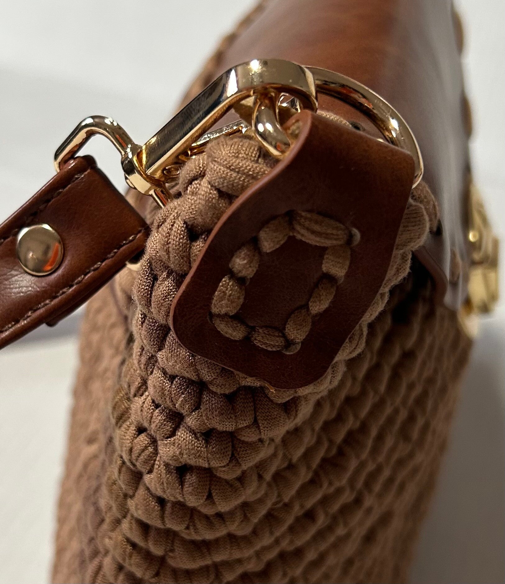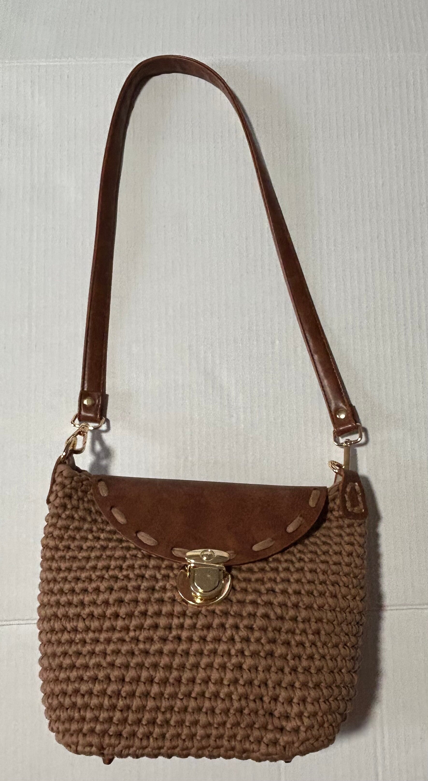 Thick Nylon and Polyester Yarn, Dark Sepia color, Lined with pocket inside, Gold accessories, base ant top in Leather, Strap in Leather not adjustable. Size: 7" x 8"