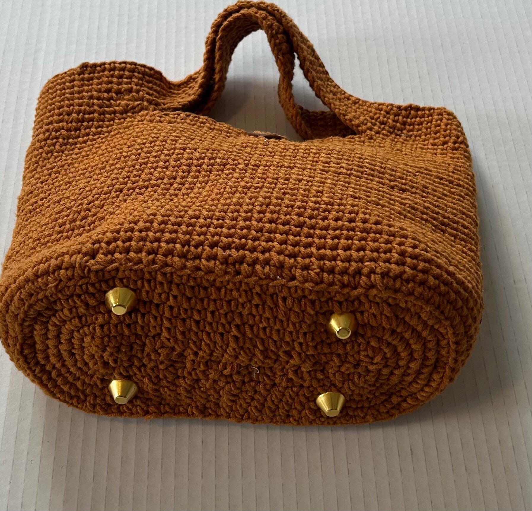 Cotton Bronze Handmade Handbag, Lined with pocket inside, Gold Assessories, Base in the same Yarn, is a Tote Purse, Shaple Handle in the same yarn, 60% Cotton an 40% acrylic. Size: 8" x 6.5" x 4"