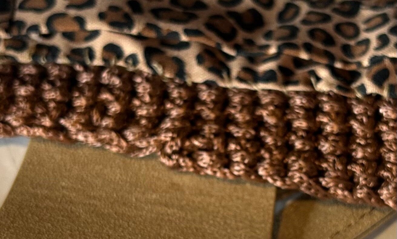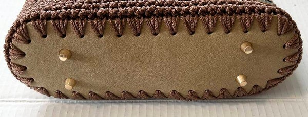 Nylon Pecan colr Handmade Handbag, Lined with pocket inside, Gold Assessories, Base in Leather, a topper in Leather thinner than the Hanbad. Strap adjustable, can be used in the shoulder as a crossbody. Size: 9.5" x 7.5" x 3.5"