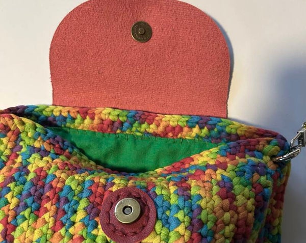 Multicolor Strech Cotton and Nylon Handmade Handbag, lined, Silver Assessories. Top in leather, long Strap to use as a crossbody or on the shoulder too you can adapt li to use as a totes, also you can take off the strap and use as a cluch bag. Size: 8" x 6.5"