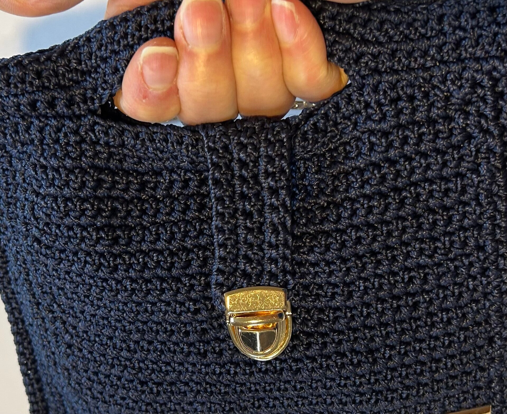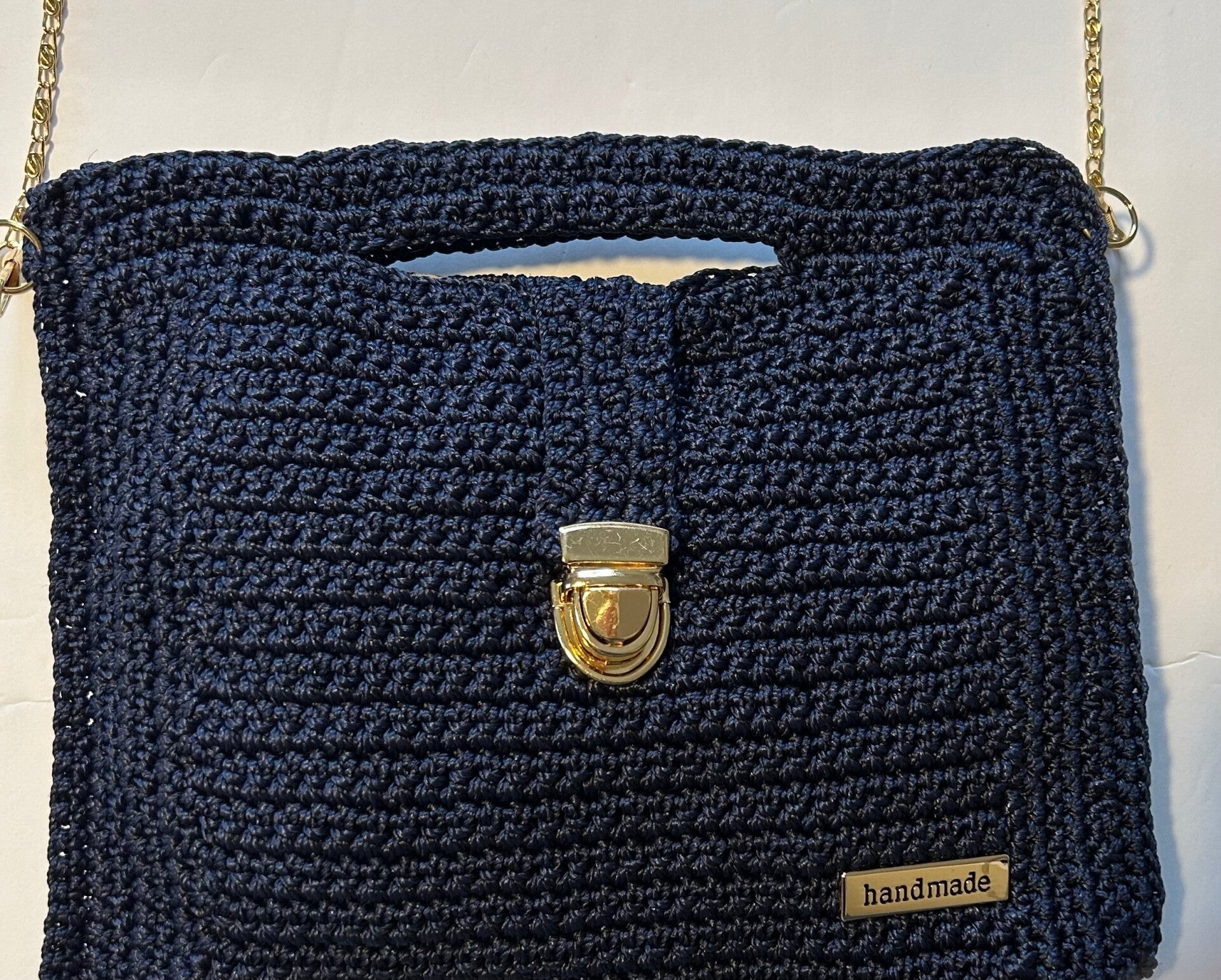 Nylon Jandmade Handbag , Lined, Gold assessories, Strap in Metal non adjustable with an opening that can used as a cluch in your hand too abd take off the long strap or put it inside, clousure with a clasp in the front. Size: 8.5" x 6"