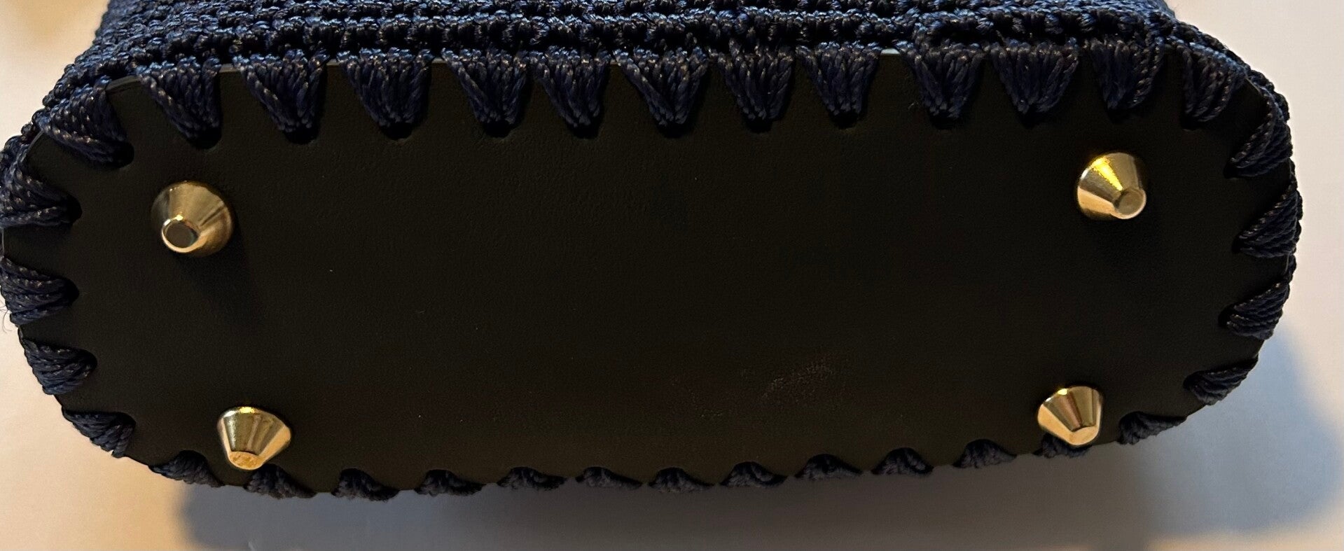 Nylon Navy Blue Handmade Handbag. Lined with pocket inside, Gold assessories, Base an Top in Leather, Strap adjustable in Leather that can be used in the shouder and as a crossbody. Size: 8" x 3" x 8"