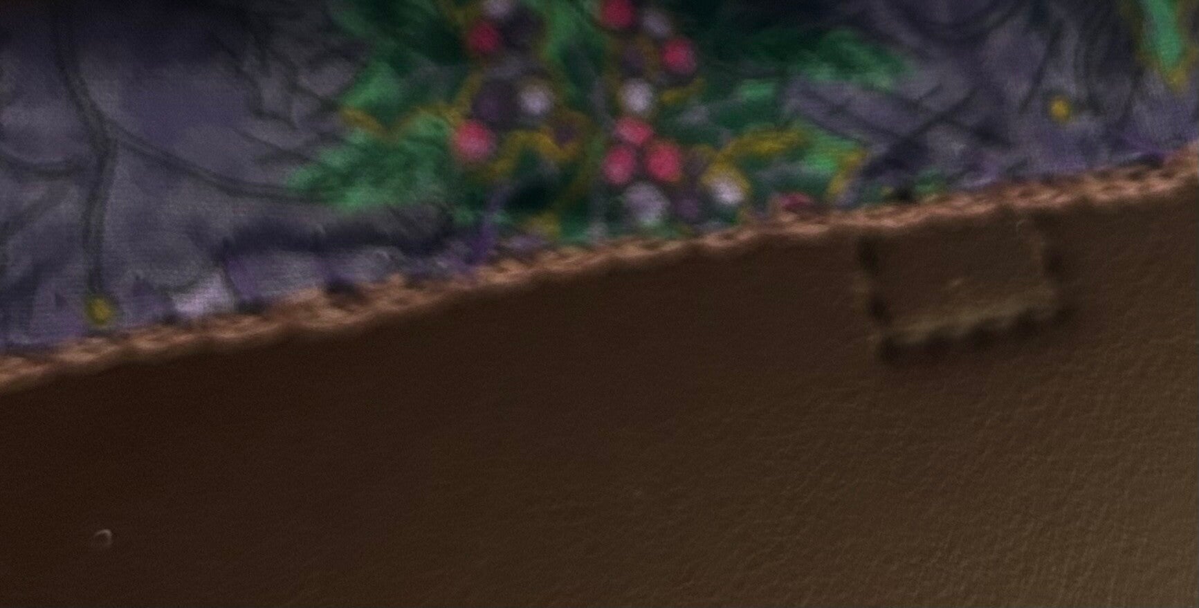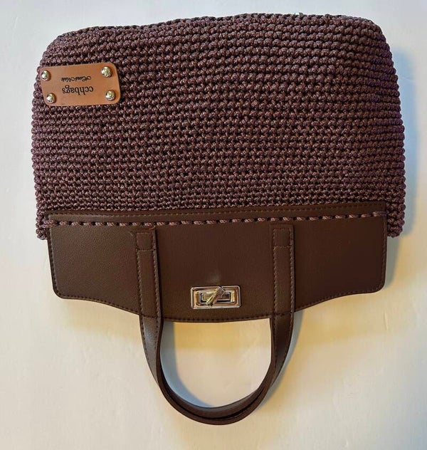 Nylon Eggplant HandBag, Lined with pocket inside, Silver Assessories, Totes with a big piece in Leather in the top with the Handles in Leather, Base in Nylon yarn, the same as the Bag. Size: 10" x 9"