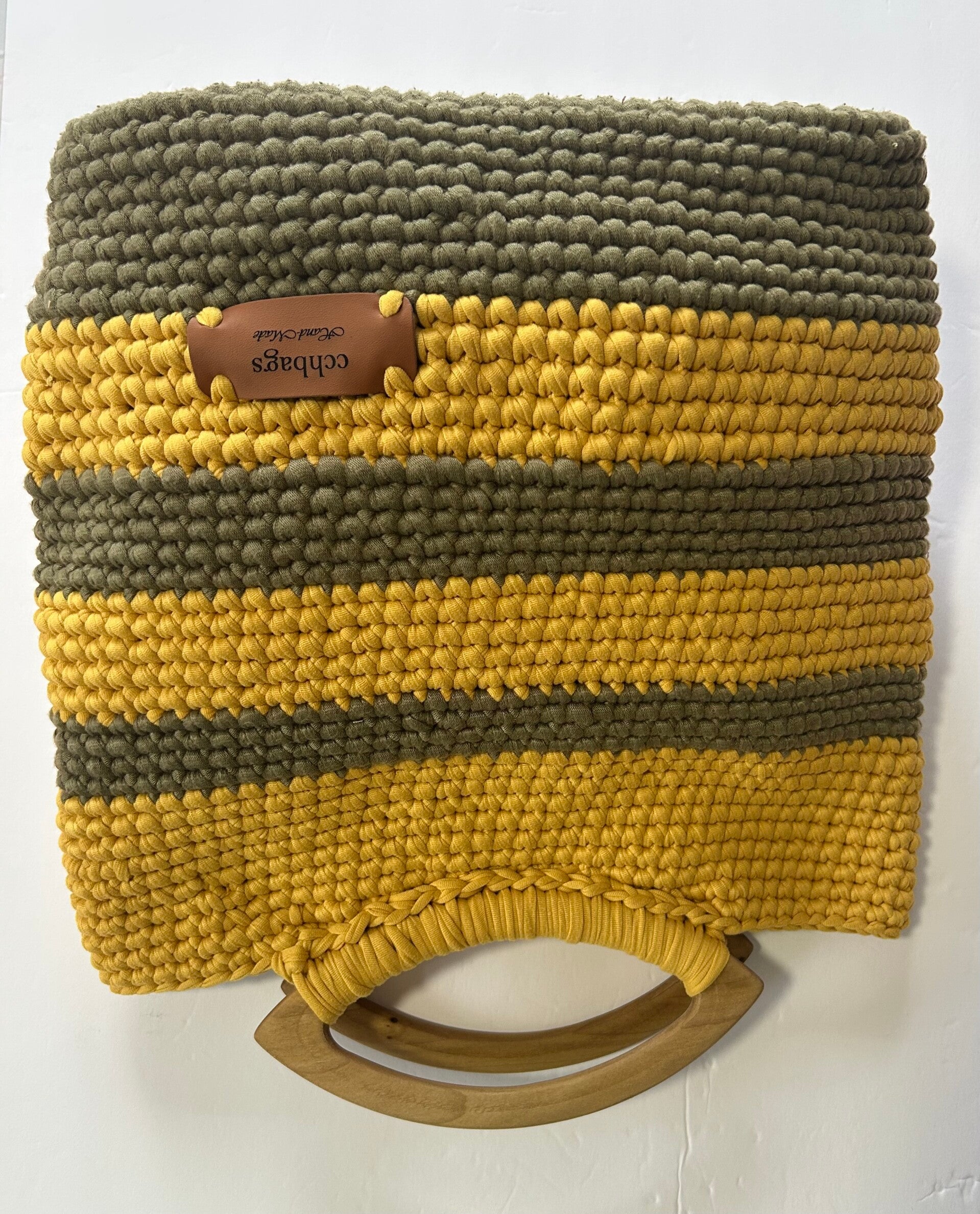 Yellow and Olive Green Big Totes Handmade HandBag, the Handles are in wood, Lined with Pocket inside, Based in Leather, Gold assessories, Size: .0