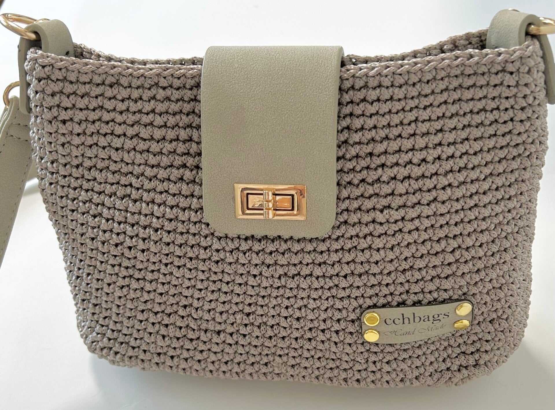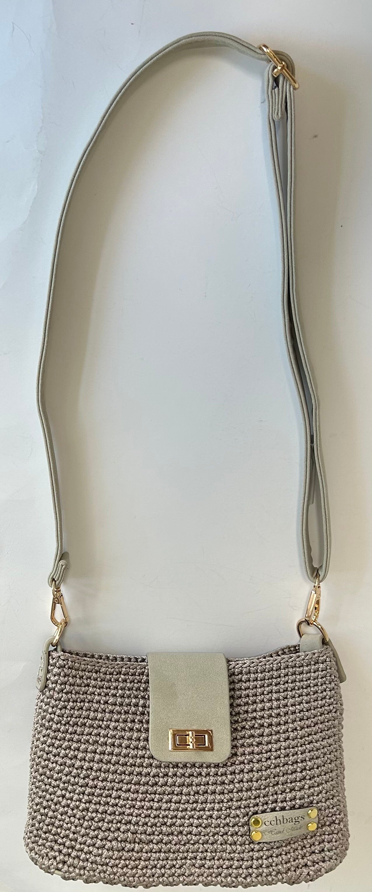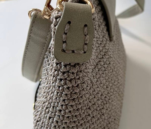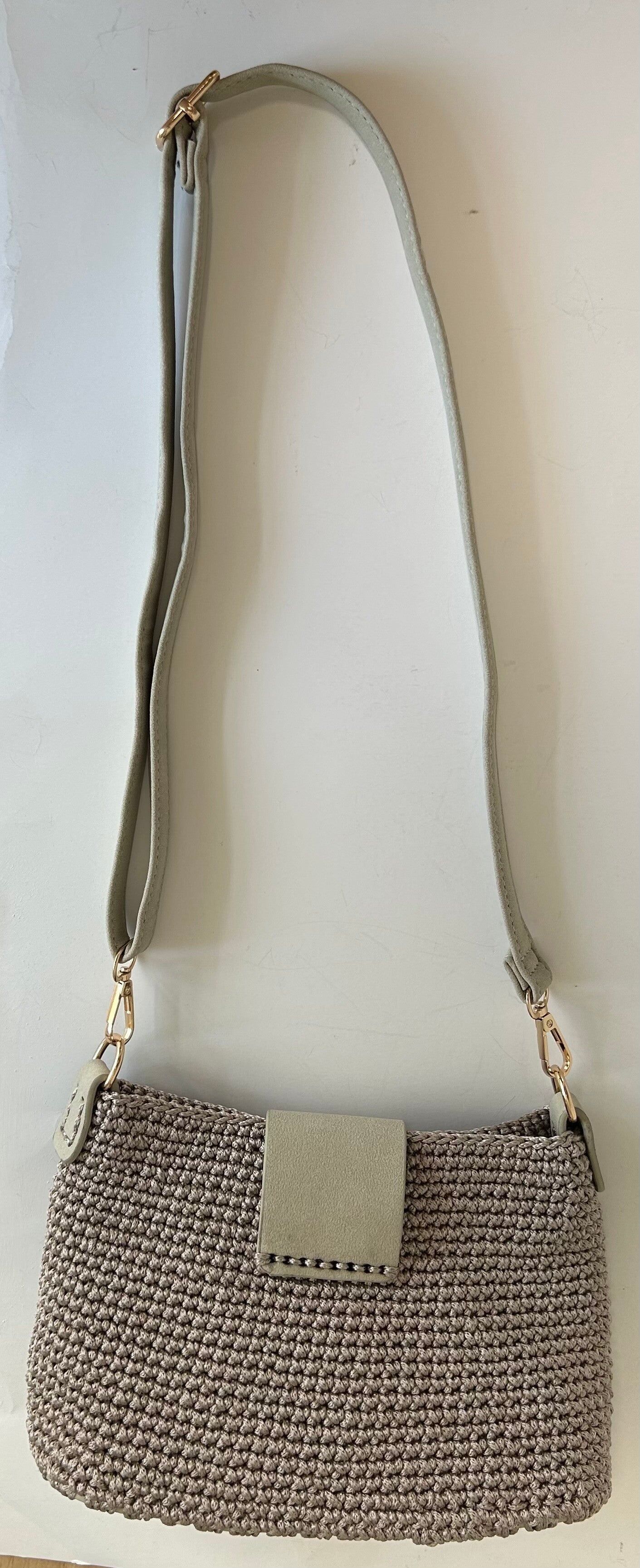 Nylon Khaki Handmade Handbag, Lined wiht pocket inside, Gold assessories, Strap adjustable in Leather,, can be use it as a crossbody, top slim cover in Leather with a beautifull brooch for clausure, base in Leather maching with the strap and the top. Size: 10" x 7"