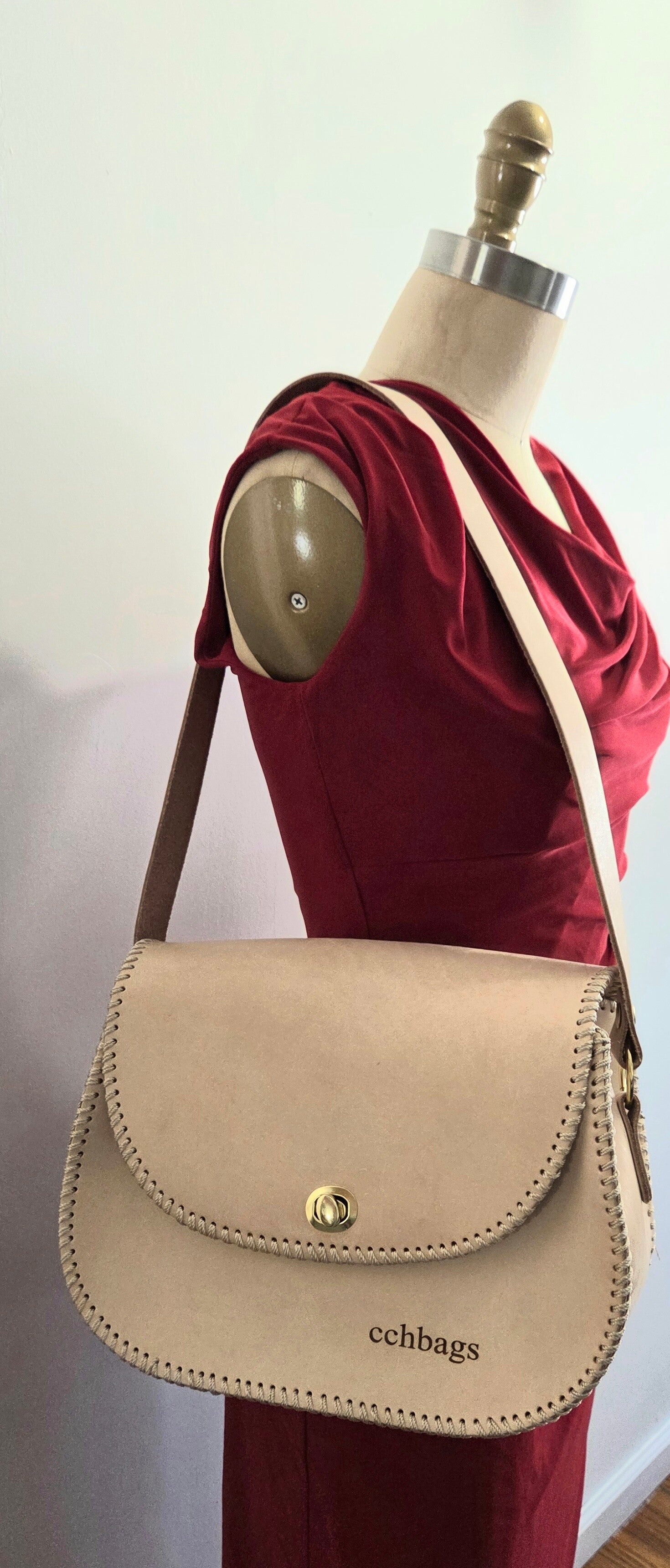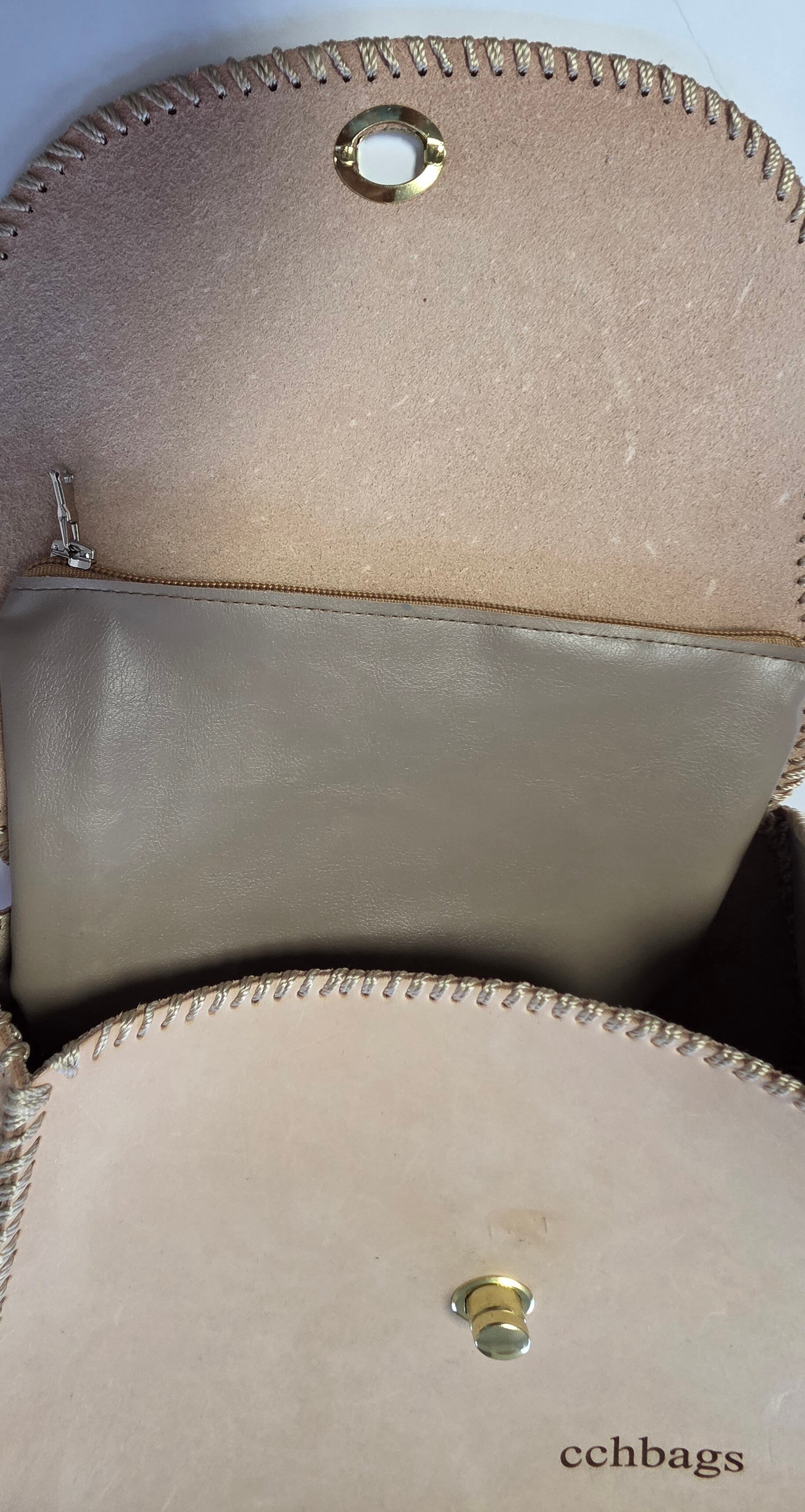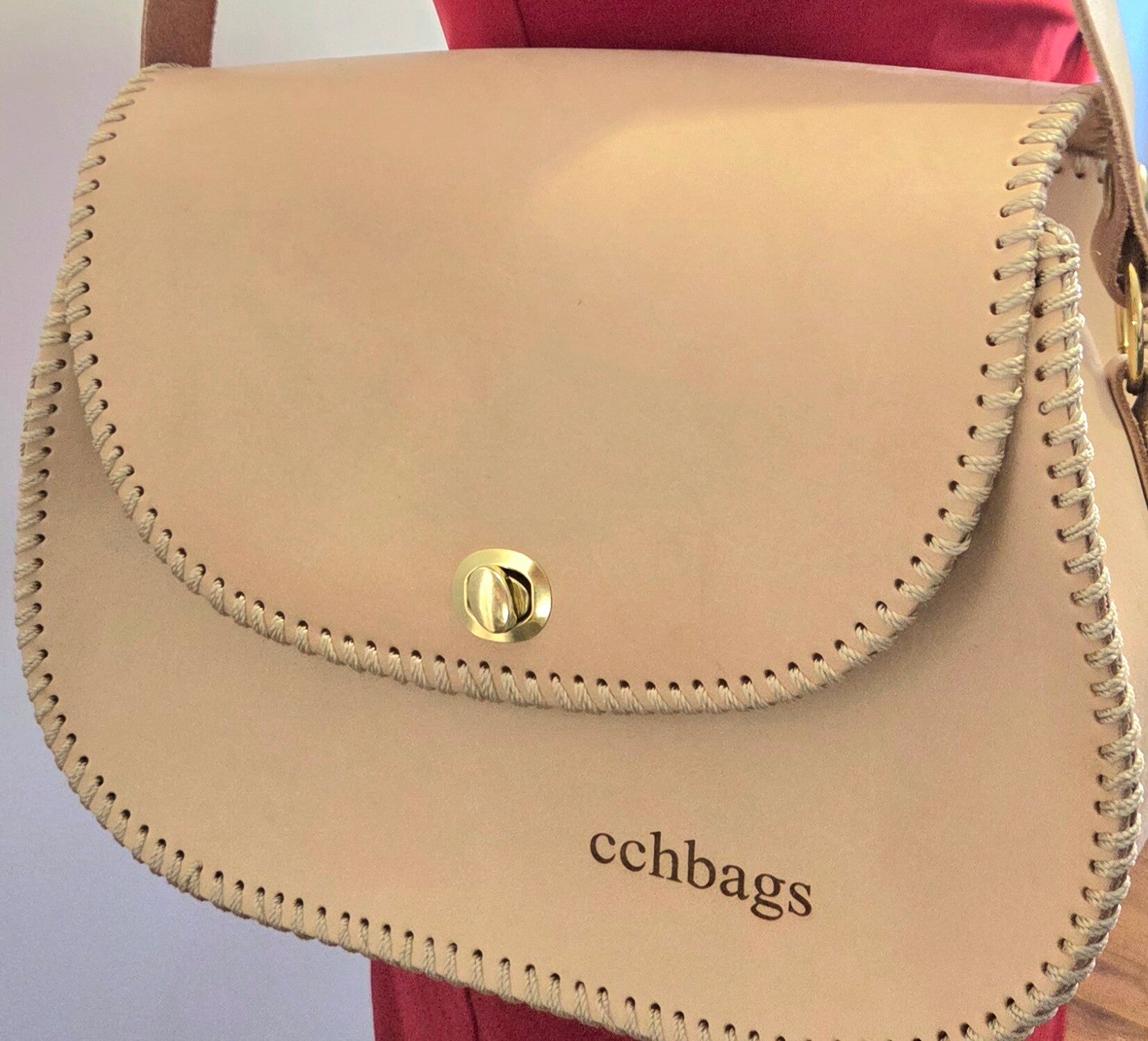 Caricia Peach Handmade Genuine Leather Handbag, Gold Assessories, it is a very firm leather, a beautifull top cover for clousure in the front with a giratoy brooch, strap in leather non adjustables for the shoulder, inside a bag that work as lining with zipper. Size: 10" x 4.5" x 9.5"