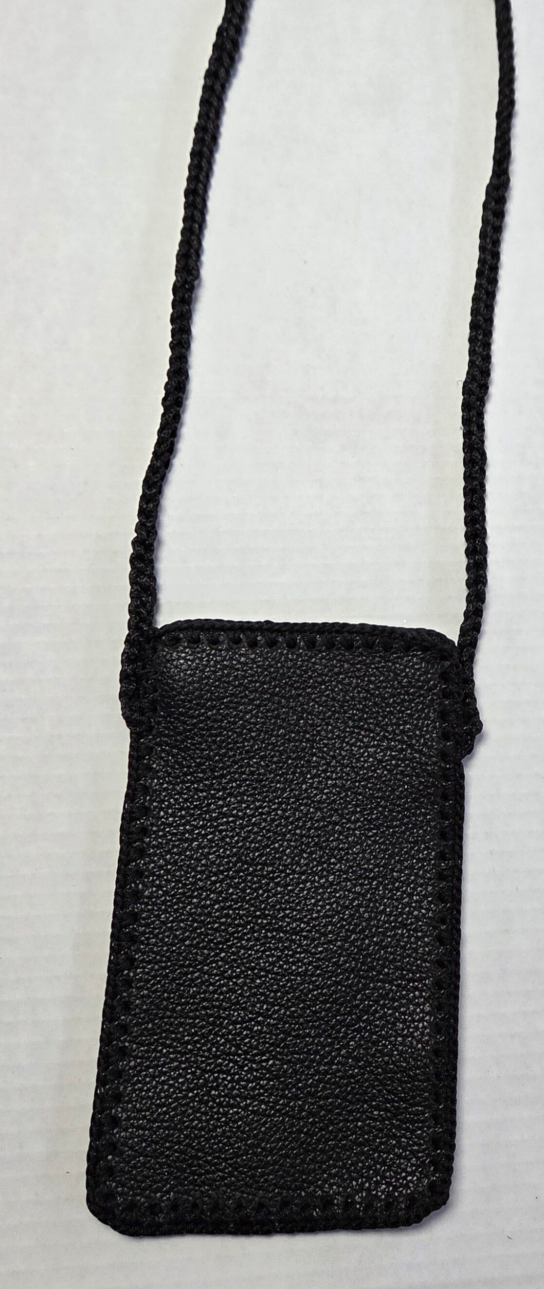 Mini Black Leather Handmade Cellphone, it is a crossbody bag for cellphone, strap in nylon. Size: 4.5" x 7.5".