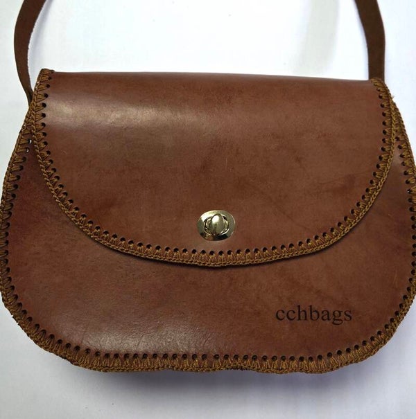 Genuine Leather Handmade Light Btown Handbag, Gold Assessories, Strap in Leather for the shoulder, a Topper with a giratory brooch for clousure, very firn leather, has a bag that work as lining with a zipper. Size: 10" x 4.5" x 9.5.