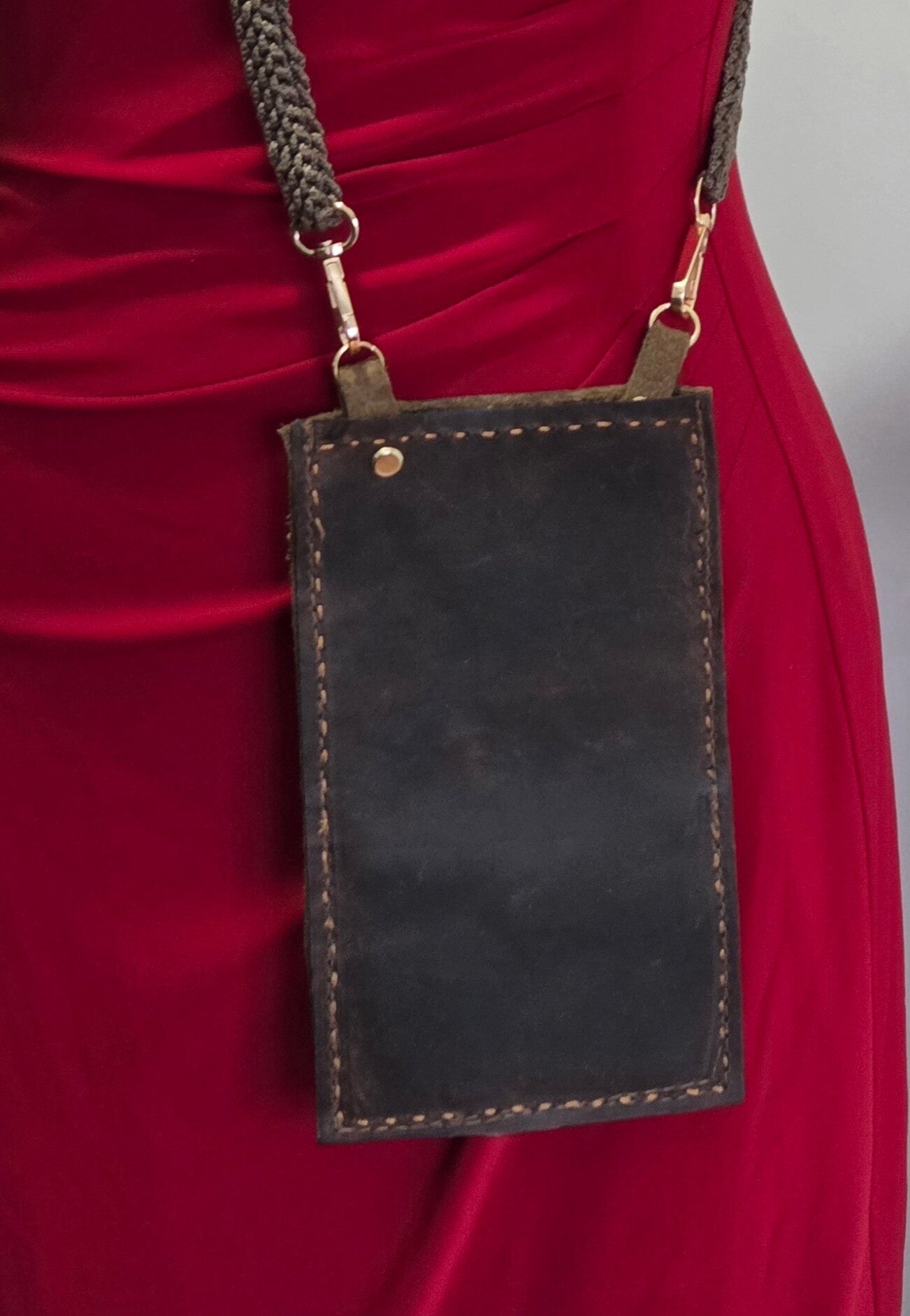 Mini Brown Handmade Genuine Cellphone Handbag, it is a crossbody, strap adjustable, gold accessories, two diferent texture of leather, one for on side and the other side diferent, space that you can use for the or the front with a snap, fit a card on it. Size: 8.5" x 5"