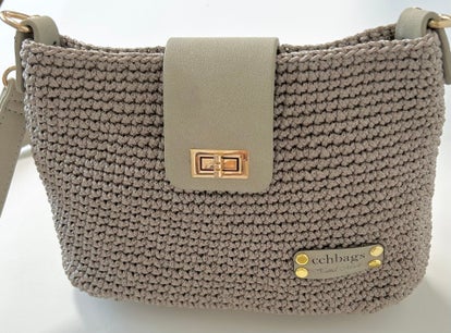Cotton Bronze Handmade Handbag, Lined with pocket inside, Gold Assessories, Base in the same Yarn, is a Tote Purse, Shaple Handle in the same yarn, 60% Cotton an 40% acrylic. Size: 8" x 6.5" x 4"
