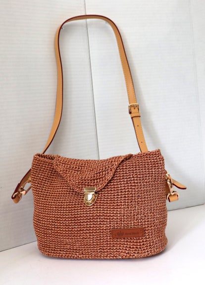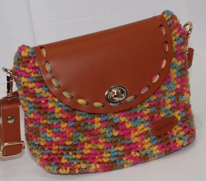 Nylon Dark Brown Hanmade Hanbag, Lined with pocket inside, Gold assesspries, Strap in Leather adjustable, can be used in the soulder or as a crossbody, Top in leather with a claps clousurure, base in the sam;e yarn as the bag, in one side have a beautiful pendant. size: 6.5" x 6"