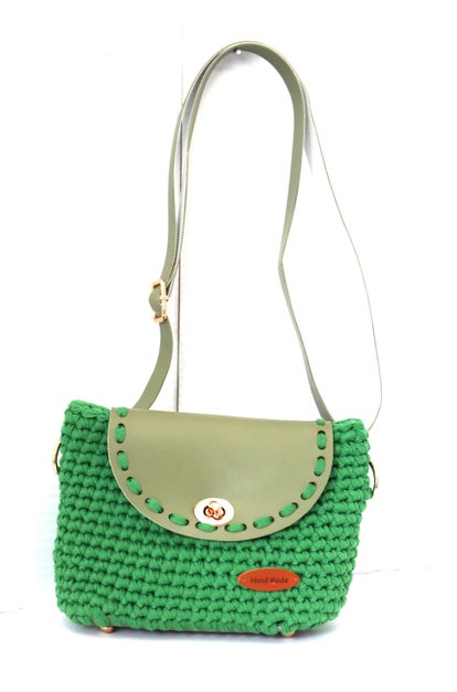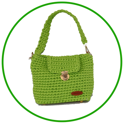 Thicn Nylon and Polyester Bright Green Hadmade Handbag, Gold Accessories, Lined with pocket inside, Base in leather, Short Strap in the same yarrn (non adjustable),