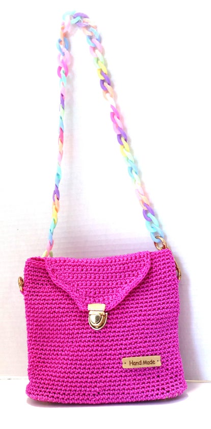 Nylon Magenta Handmade Handbag, Lined with Pocket inside, Accessories in Gold, Strap beautifull inon adjustable in Plasrtic Acrilic Slike a raibow color,