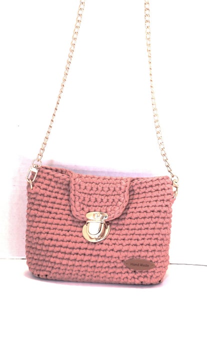 Nylon Handmade Handbag,lined with pocketninside, Silver color accessories, Metal strap in Silver non adjustable, base in the same Yarn as the bag.